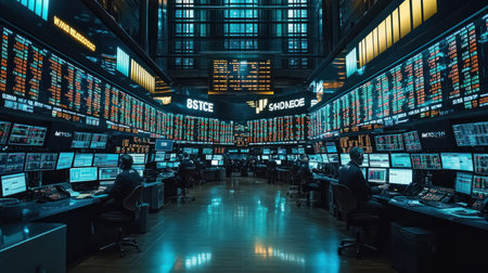 A modern stock exchange trading floor with digital displays and monitors