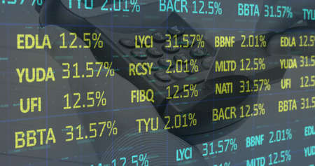 Image of financial data processing over payment terminal. global online shopping, business, finances, data processing and digital interface concept digitally generated image.