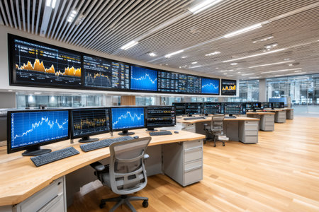 Modern financial trading room featuring multiple monitors presenting real time market charts and data