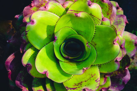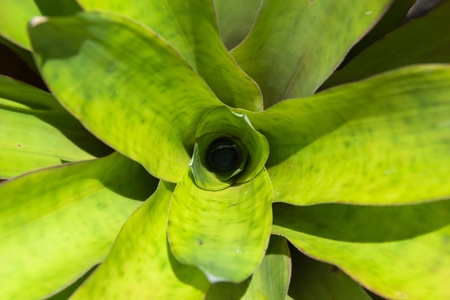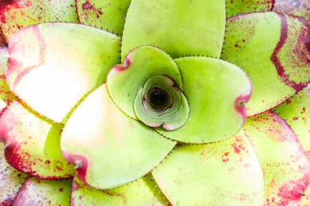 Detail of bromelia with its leaves, circular shape, colors and texture features
