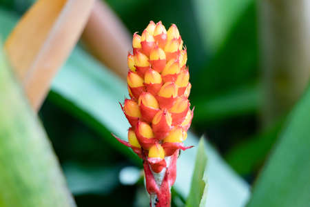Close-up of yellow-red Bromeliads flowers blooming in the tropical garden on green leaves background. (Bromeliaceae)