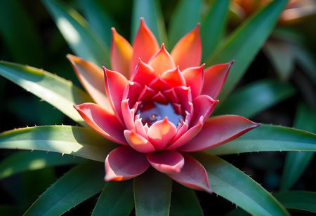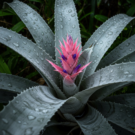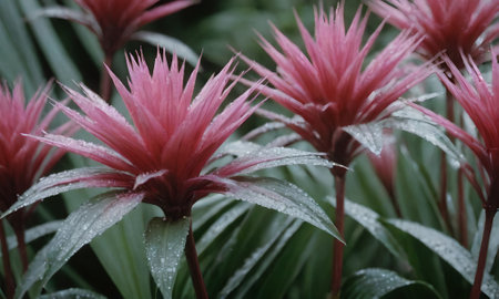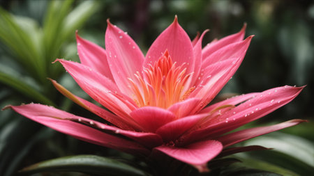Close-up of a beautiful guzmania lingulata flower with vibrant pink petals, holding water in its center, surrounded by spiky green leaves