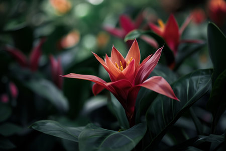 Amazing tropical plant with green leaves and red flowers, minimalism, botanical garden