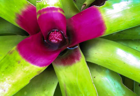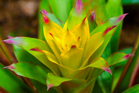 Colorful ornamental plant. Bromeliad plants or Urn Plant. Close up of brazilian bromeliad (family Bromeliaceae, subfamily Bromelioideae) green leave background.