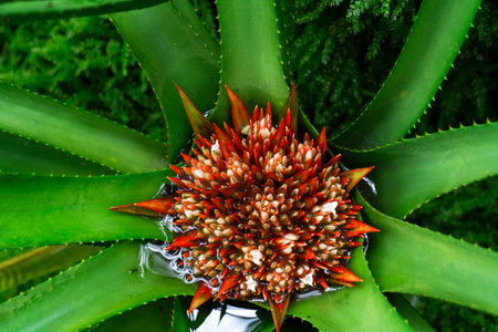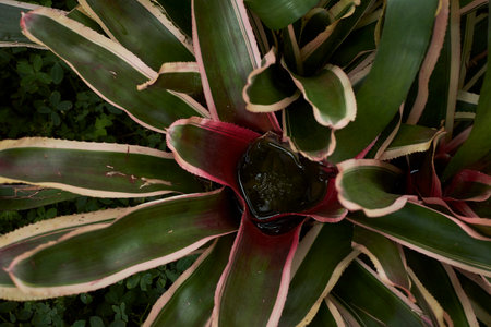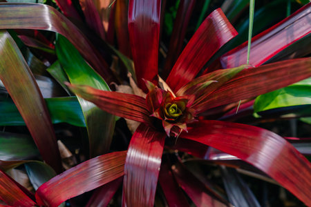 Bromeliad plant on the top view with the green leave at the garden,red bromeliad plant in the garden