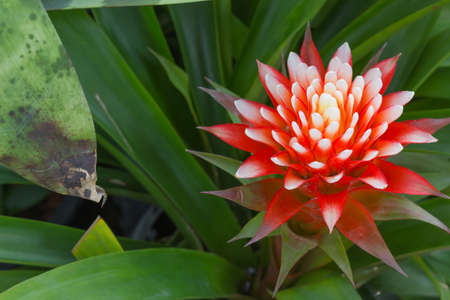 Red Bromeliad flower with green leaf background. Nature colorful flower background in garden at Thailand
