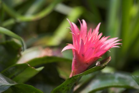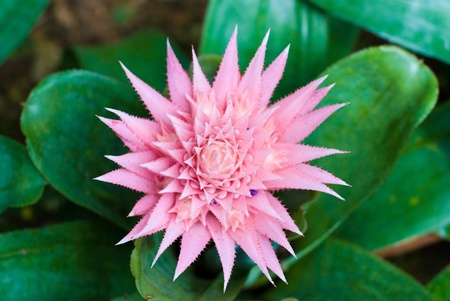 Pink Bromeliad, Flower, Variegated Leaves, Close-Up,