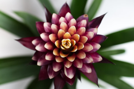 Close-up of beautiful purple bromelia flower with green leaves on white background. Top view. Macro photo.