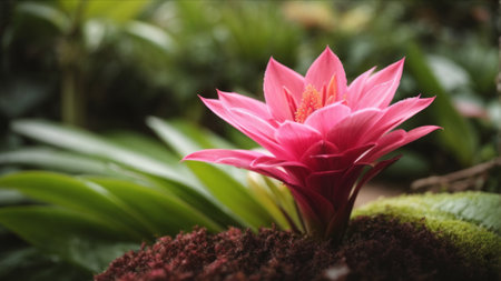 A breathtaking pink flower opens gracefully amid lush green leaves, showcasing natural beauty and elegance. Perfect for nature-themed projects and botanicals.