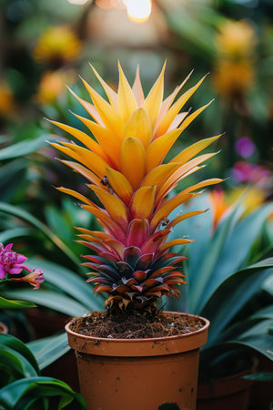 A stunning bromeliad plant sits gracefully in a sleek modern pot, bringing vibrant colors and life to any indoor space with its stunning tropical foliage.