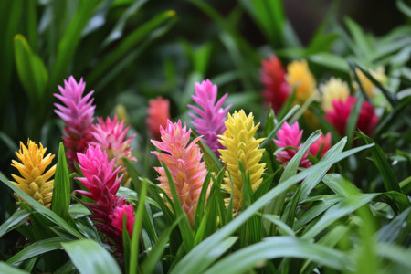 Vibrant bromeliad plants with spiky, upright flower stalks in red, yellow, orange, and pink, surrounded by lush green leaves, creating a colorful natural pattern.