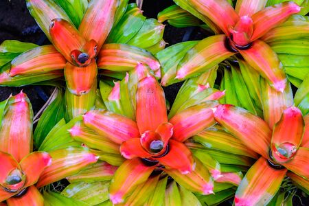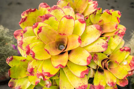 Closeup various multicolored bromeliad plants, colorful bromeliad leaves, tropical plant