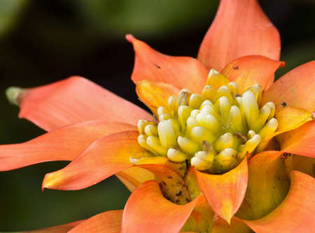 Close up of yellow and orange Bromeliad flower in the dark background.
