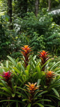 A cluster of vibrant bromeliad plants with red, orange, and yellow flowers blooming amidst lush green tropical foliage in a forest setting.