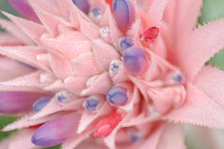 Pink flower Aechmea (Bromeliaceae) on gentle light green-pink blurred background with bokeh texture in pastel vintage style.