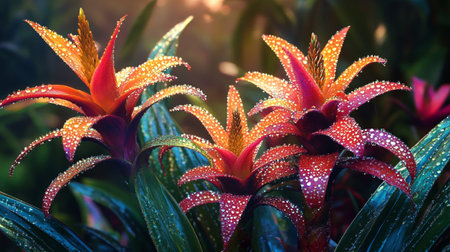 A dramatic close-up of a tropical flower with vivid colors, showcasing water droplets that enhance its beauty, set against a contrasting dark background