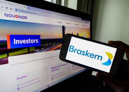Braskem SA logo visible on smartphone screen, and website page showing stock chart of the stock in the background