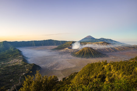 Stunning view of the Mount Bromo, Mount Batok and Mount Semeru during sunrise. Mount Bromo is an active volcano and one of the most visited tourist attractions in East Java, Indonesia.