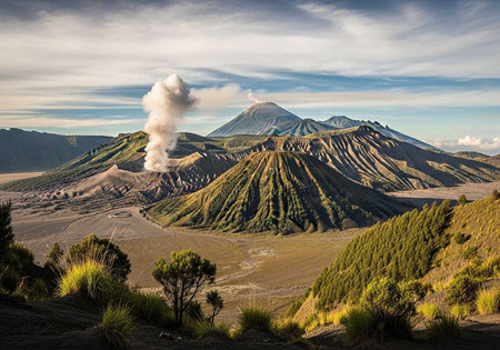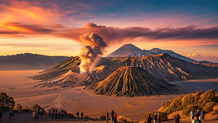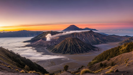 Scenic view of Mount Bromo crater with volcanic smoke, surrounded by the dramatic landscape of the Tengger Caldera. A breathtaking natural wonder.