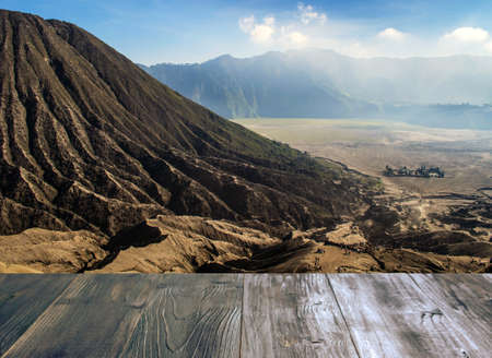 vintage wood terrace with view of volcano mountain bromo in Tengger Semeru National Park, East Java, Indonesia, soft focus, selective focus, copy space.