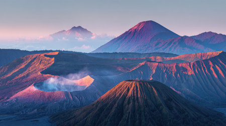 Stunning view of the Mount Bromo, Mount Batok and Mount Semeru during sunrise. Mount Bromo is an active volcano and one of the most visited tourist attractions in East Java, Indonesia.