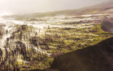 Mist flowing over Cemoro Lawang village in the morning located to northeast of Mt Bromo, Indonesia