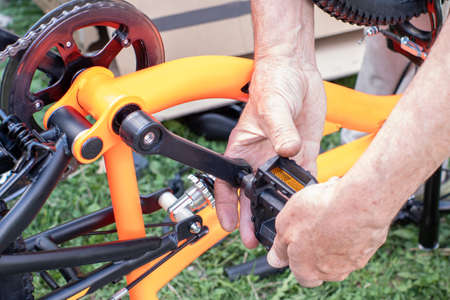Bicycle repair. Close-up of a mechanic installing and adjusting pedals on a new bike.