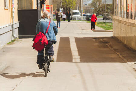 An elderly man rides a bicycle. Sports in old age. Cycling with a backpack.