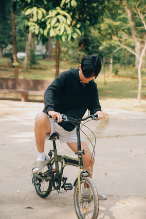 Happy young Asian woman while riding a bicycle in a city park. She smiled using the bicycle of transportation. Environmentally friendly concept.