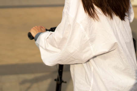 A girl in a loose white jacket rides on a black scooter, close-up, side view. A shot with long hair. Photo in motion. Walk around the city. outside shooting