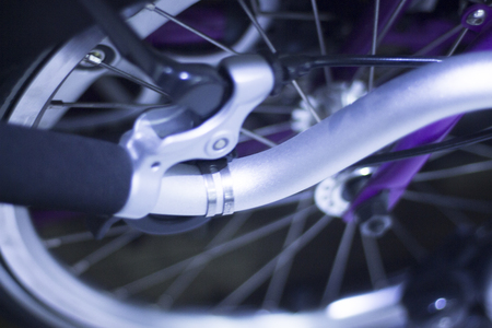 Part of a sport and modern bicycle in dark, accentuated shapes with lights.