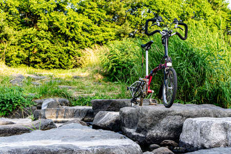 GEOJE, SOUTH KOREA - JUNE 15, 2017: Brompton folding bike park in front of the small stream in the suburb of South Korea.