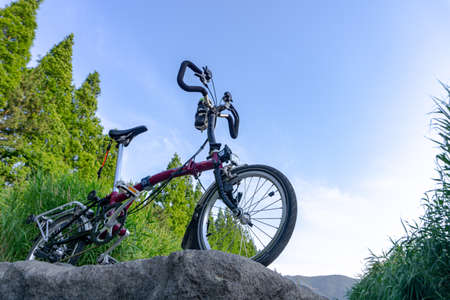 GEOJE, SOUTH KOREA - JUNE 15, 2017: Brompton folding bike park on the rock in the suburb of South Korea.