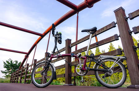 GEOJE, SOUTH KOREA - JUNE 15, 2017: Brompton folding bike parks on the suspension bridge across small stream in the suburb of South Korea.