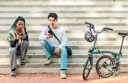 Two diverse college friends sit on sunlit campus steps, consulting a smartphone beside a compact folding bicycle and helmet, illustrating eco friendly urban commuting and modern student life.