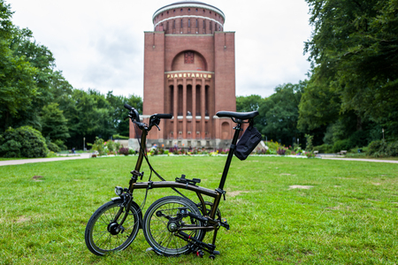 Hamburg, Germany - July 14, 2018: The Brompton black lacquer edition bike in front of the Planetarium.