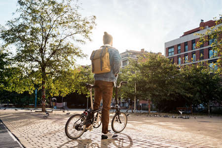 Handsome happy young man with bicycle on a city street, Active lifestyle, people concept