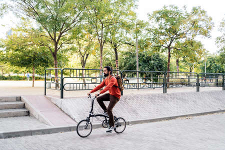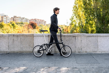 Stock photo of handsome man walking in the street carrying his detachable bike.