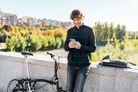 Stock photo of unrecognized man using his smartphone in the street and carrying his detachable bike.