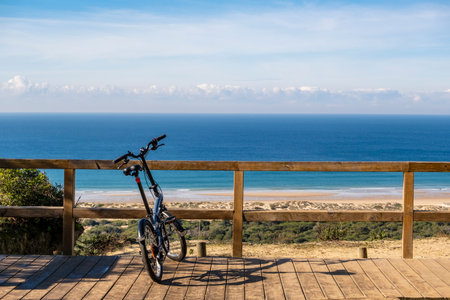 Bicycle outdoor parked on beach sea shore. Brake element. Holidays, sport and summer recreation.