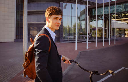 A handsome urban businessman rides his bicycle to work. e-co friendly transportations concept.