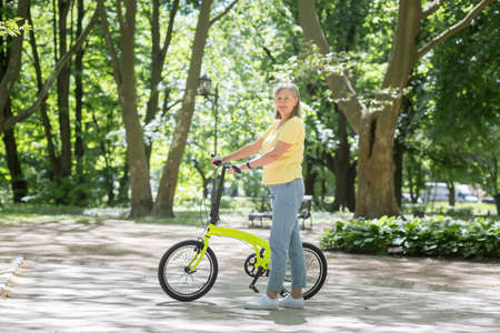 Retired woman resting in the park, gray-haired Persian woman walks with a bicycle on a summer day