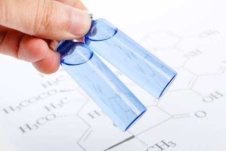 Glass medical ampoule vial for injection. Medicine is liquid sodium chloride with of aqueous solution in ampulla. Close up. Bottles ampule multicolor on background color and water. Human plasma.