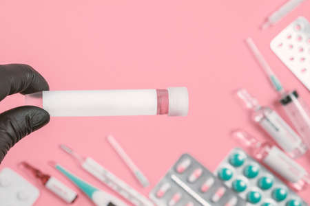Flat Lay for medical theme and vaccinations from COVID-19. Medicine, vaccine, hands of a doctor
