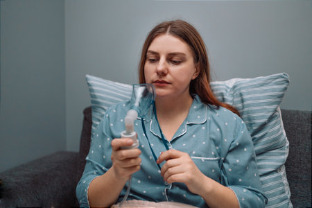 Portrait of young sick woman putting on nebulizer mask on face to make inhalation, using an inhaler at home. Medical inhaler emergency equipment, asthmatic attack. High quality photo