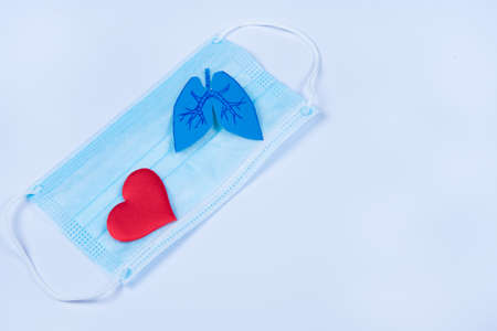 Paper lungs and red heart on protective mask, blue background.