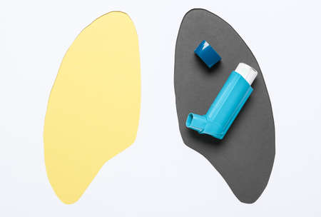 Creative composition with inhaler and lungs made of paper on white background