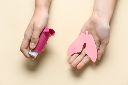 Female hands with paper lungs and asthma inhaler on beige background