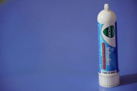 Tube of Vicks Vapo Inhaler on an isolated blue background. A 0.5 ml Vicks inhaler tube isolated. : Dubai UAE - March 2020