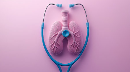 Mockup of human lungs in pink and blue phonendoscope on a pink background with space for text, created with Generative AI technology